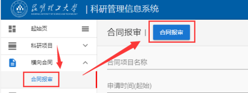 4.导航栏横向合同→合同报审→合同报审填写(请根据“合同登记证明”填写内容,附件无需上传)→点击“操作”中“提交”按钮,状态变为“待审核”即可。