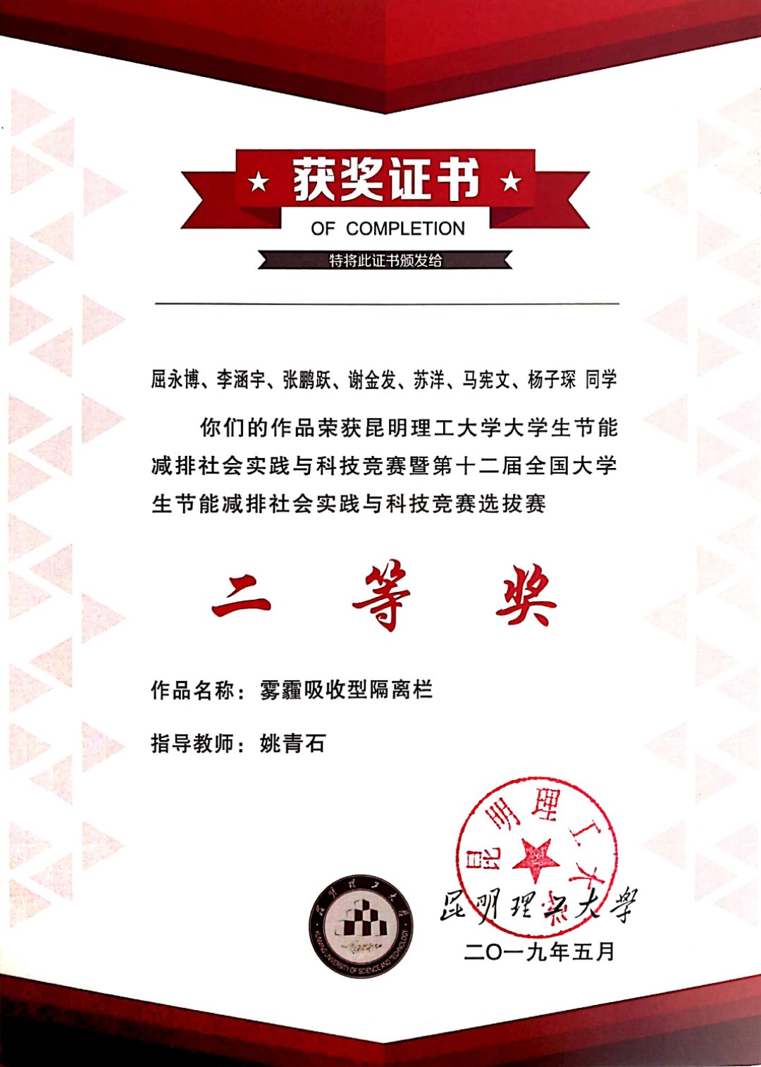 姚青石老师指导的作品雾霾吸收型隔离栏荣获昆明理工大学大学生节能减排社会实践与科技竞赛暨第十二届全国大学生节能减排社会实践与科技竞赛选拔赛二等奖。