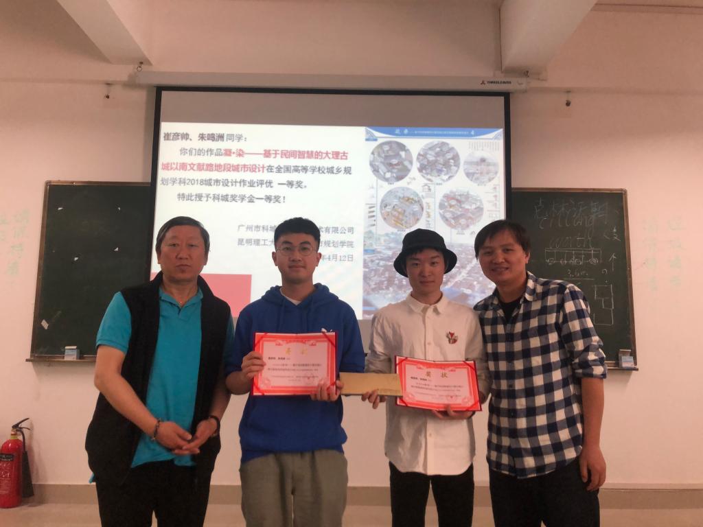 1.崔彦帅,朱鸣洲同学(2014级城市规划本科):在2018年“全国高等学校城乡规划学科城市设计课程作业评优”中,方案“凝·染——基于民间智慧的大理古城以南文献路地段城市设计”荣获一等奖,获科城奖学金一等奖;