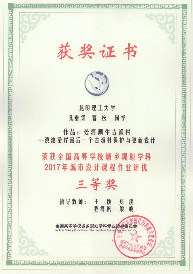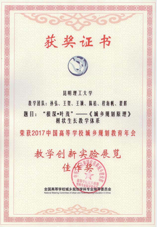 城乡规划系师生以“`根深·叶茂'——《城乡规划原理》树状生长教学体系”荣获2017中国高等学校城乡规划教育年会“教学实验创新展览佳作奖”;以“晏海潮声古渔村——滇池沿岸最后一个古渔村保护与更新设计”荣获中国高等学校城乡规划学科“2017年城市设计课程作业评优三等奖”。