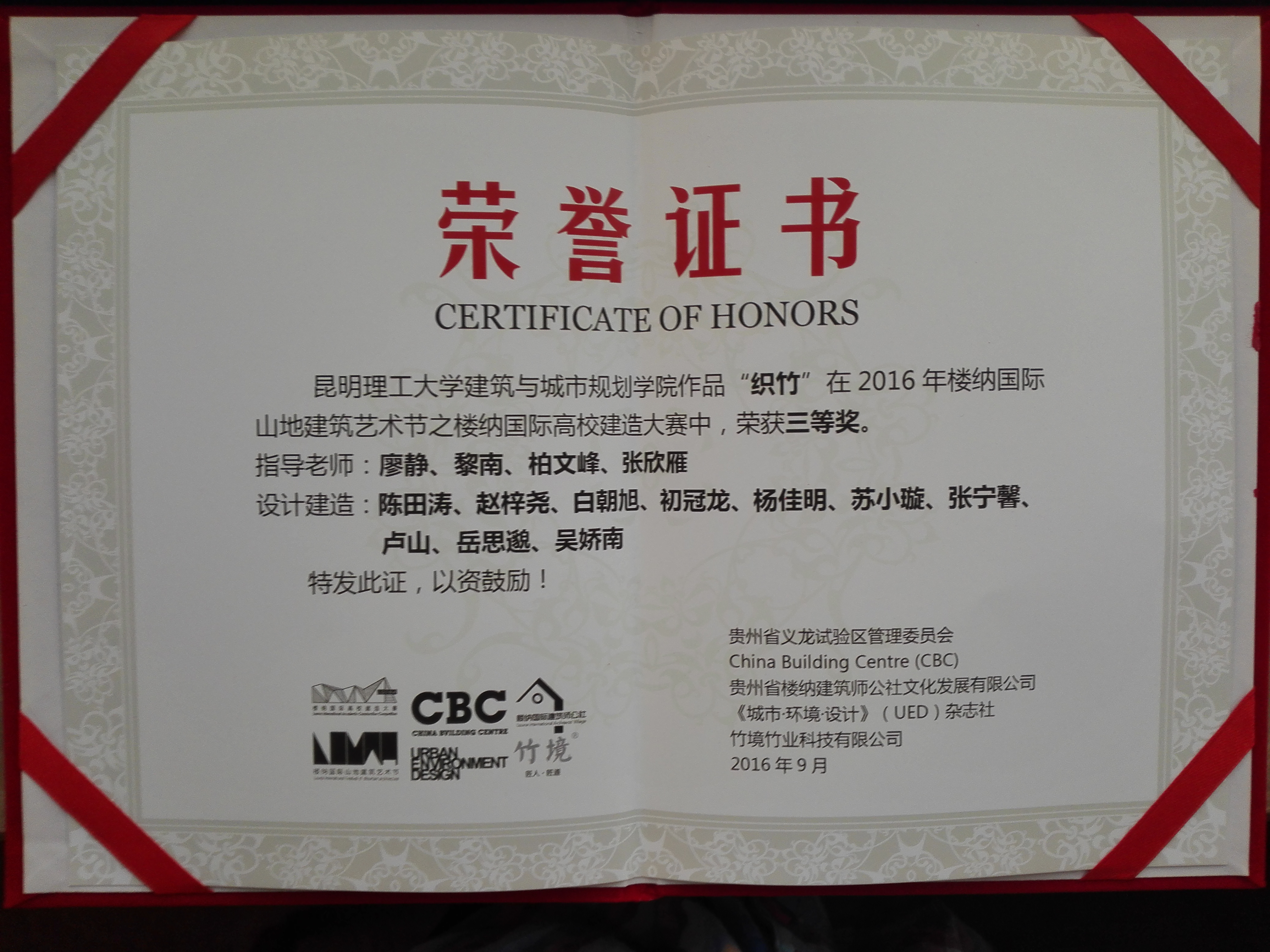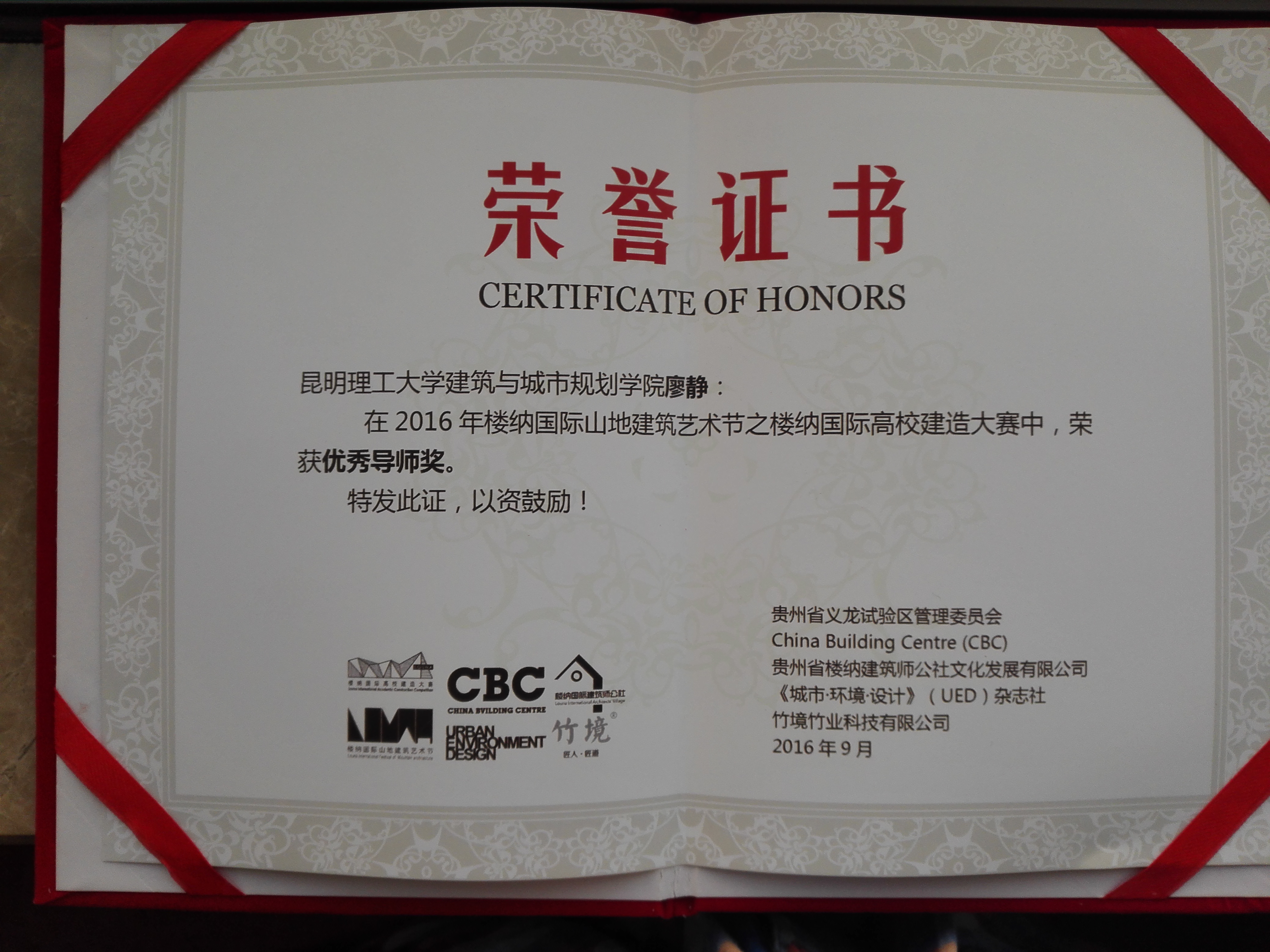 在“首届楼纳国际高校建造设计大赛”中获得三等奖一项和优秀导师奖一项。