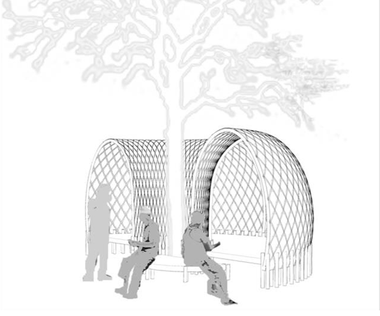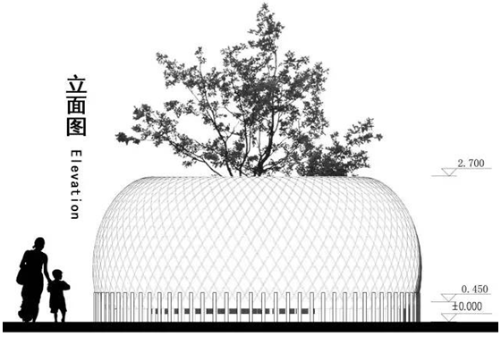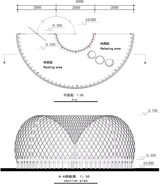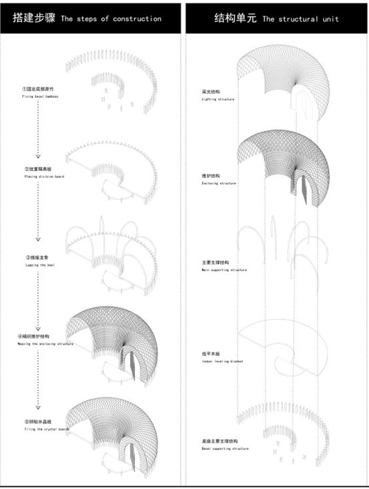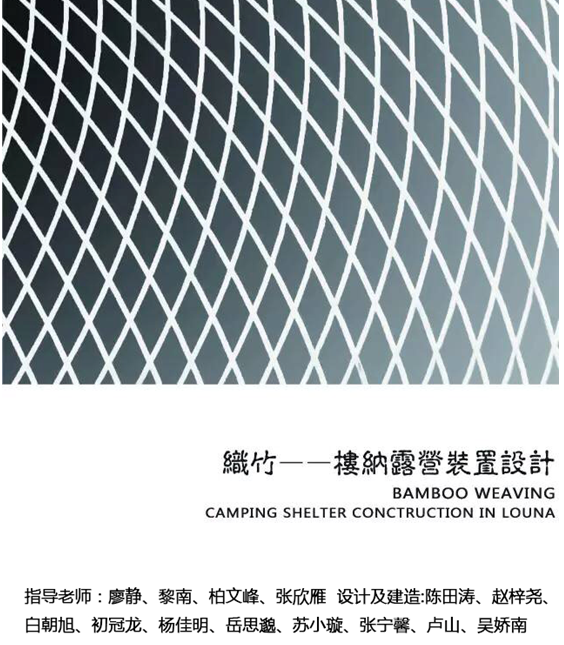 装置形态受到当地丘陵地形和树木发散生长的启发。设计充分发挥了竹材的韧性,采用匠人编织的手法,形成了一个半环状的“壳体”,编织由内即外的发展、延伸和发散,象征着生生不息的生命,“织竹回文”的空间表达了对乡土技艺的致敬。