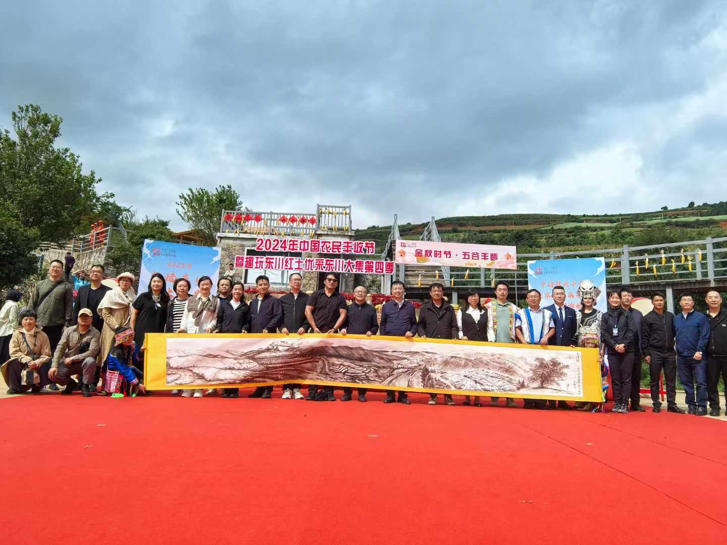 协办,共同举办了2024年中国农民丰收节暨学用千万工程礼赞丰收中国“趣玩东川·红土优采”东川大集系列活动。本次活动主会场开幕式在红土地镇落霞沟举行,学院钟金栋书记、杨毅院长、余红珍副书记和学院教师代表参加了活动,学院教师在开幕式上现场作画,为丰收节献上“红土风情、乡村新貌”长卷,礼赞丰收。