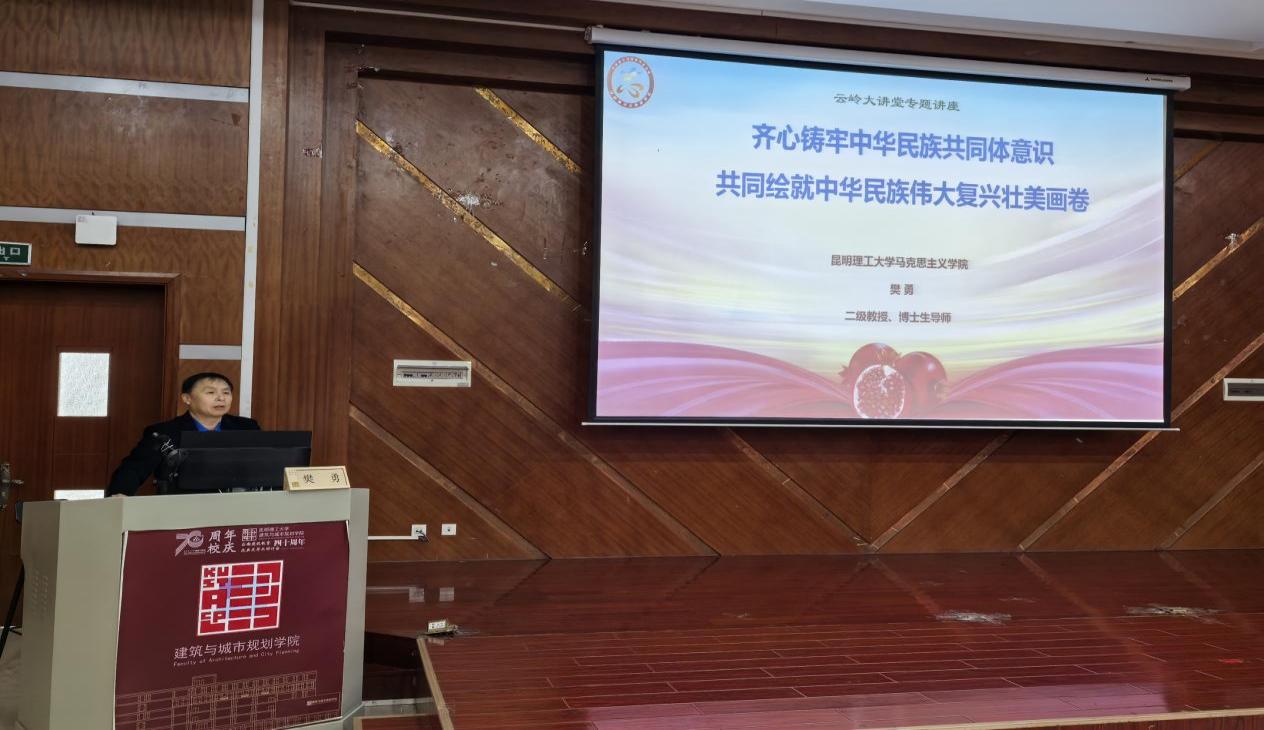 于建筑楼200报告厅举办“云岭大讲堂·文化昆工讲坛”第一百一十一讲,邀请昆明理工大学马克思主义学院樊勇教授进行了“齐心铸牢中华民族共同体意识,共同绘就中华民族伟大复兴壮美画卷”主题讲座,建筑学院300余名师生参加了此次活动。