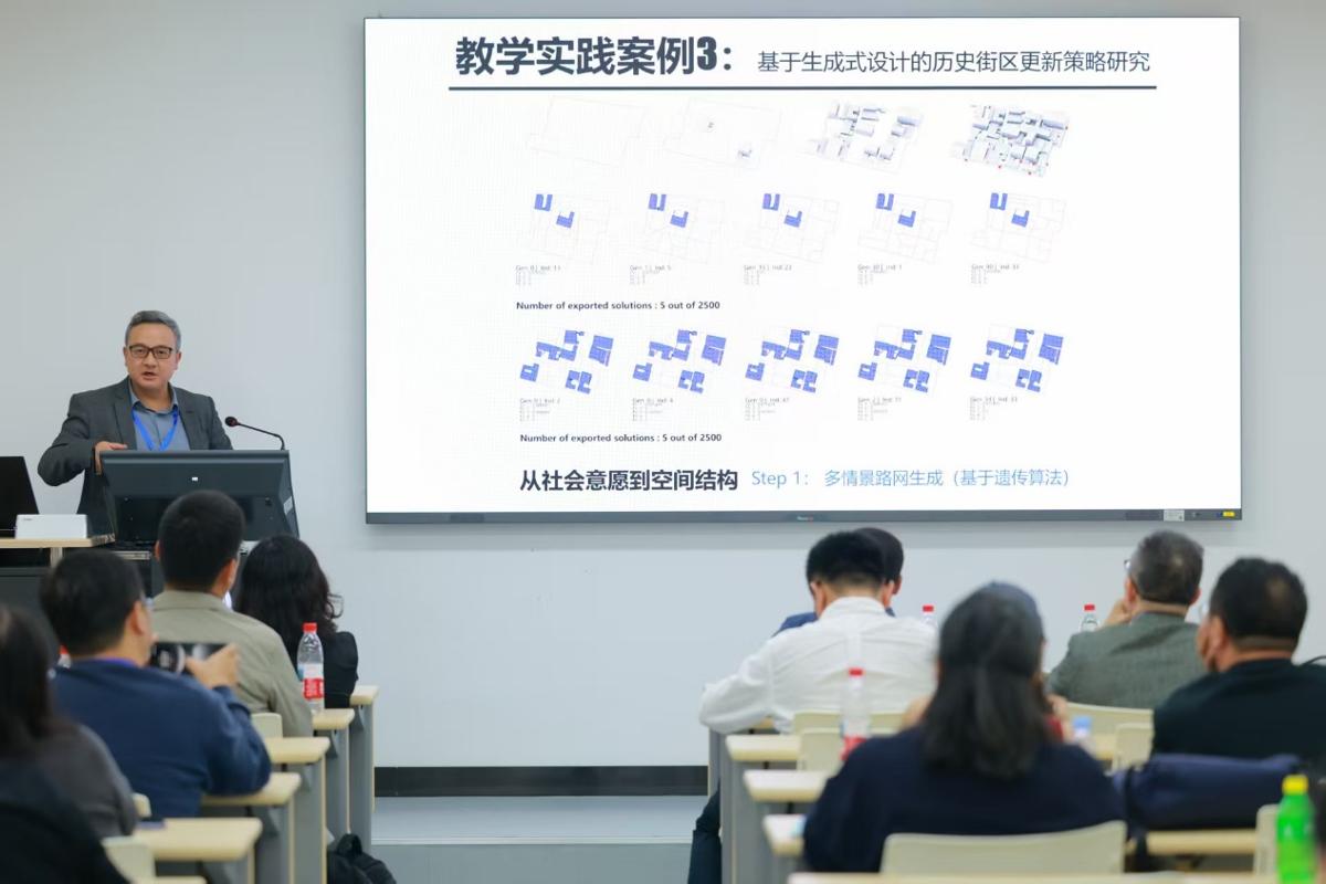 在AI辅助设计教学方面的系统化实践,包括参数化生成设计、环境性能模拟、遗产数字化保护等方向的教学案例。他指出,AI不仅是工具,更是设计思维的重构媒介,教学中应注重“逻辑建构—数据训练—结果批判”的全流程训练,培养学生对智能设计的批判性使用能力。