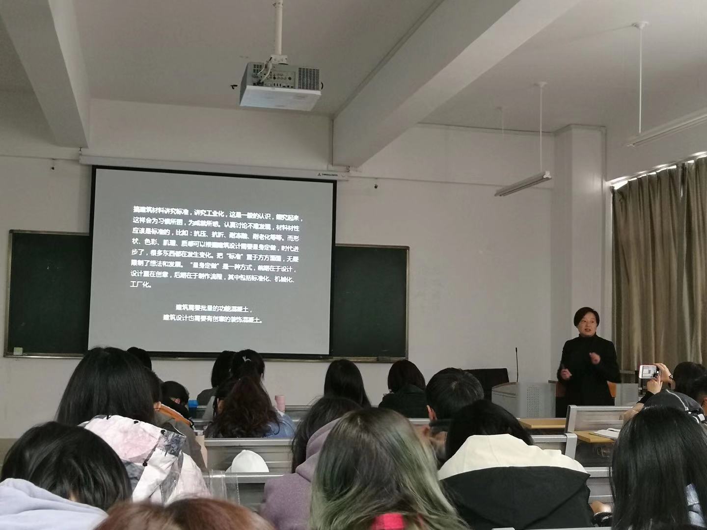 首先以混凝土应用范围及实例为切入点,李老师进而引出了宝贵集团的创新产品——“再造石”,应用自主研发的创新材料装饰混凝土面玻璃纤维增强混凝土板,以纤维增强混凝土表面的连接力,使其可以将厚度做到很薄以用做装饰。加工过程也是相对繁琐,支模阶段应用了宝贵公司的专利发明用聚苯板制成阴模,及降低成本也能增加效率;墙板悬挂于钢架上使其独立于建筑的支撑结构存在,同时对于悬挂墙板的钢架进行热镀锌处理增加原钢架的耐久度。而最终对于墙板的加工使用人工进行剔、剁、磨、擦、挠等产生不同的肌理效果,对于不同的肌理李老师也给了相应的实例进行说明,向同学们传达出了建筑需要功能混凝土也需要装饰混凝土的核心思想。