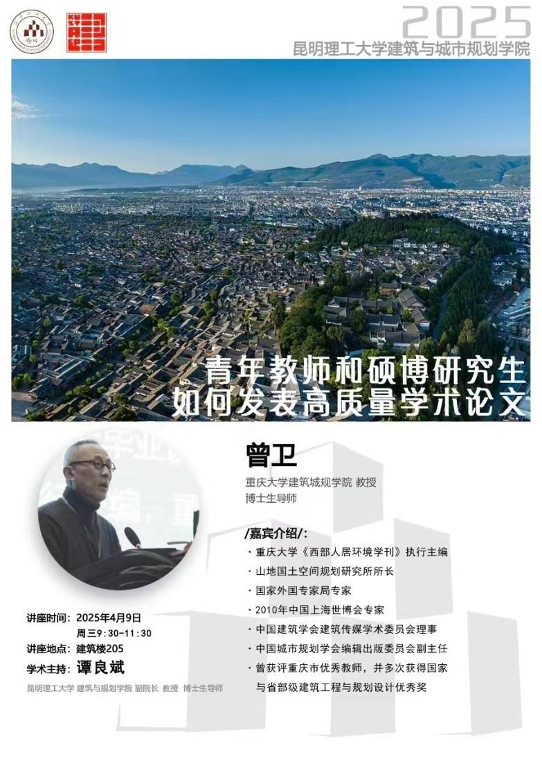 邀请到重庆大学建筑城规学院曾卫教授进行了主题为“青年教师和硕博研究生如何撰写和发表高质量学术论文”的专题讲座。学院年轻教师,博士研究生、硕士研究生共50余人参加了讲座,讲座由学院副院长谭良斌教授主持。