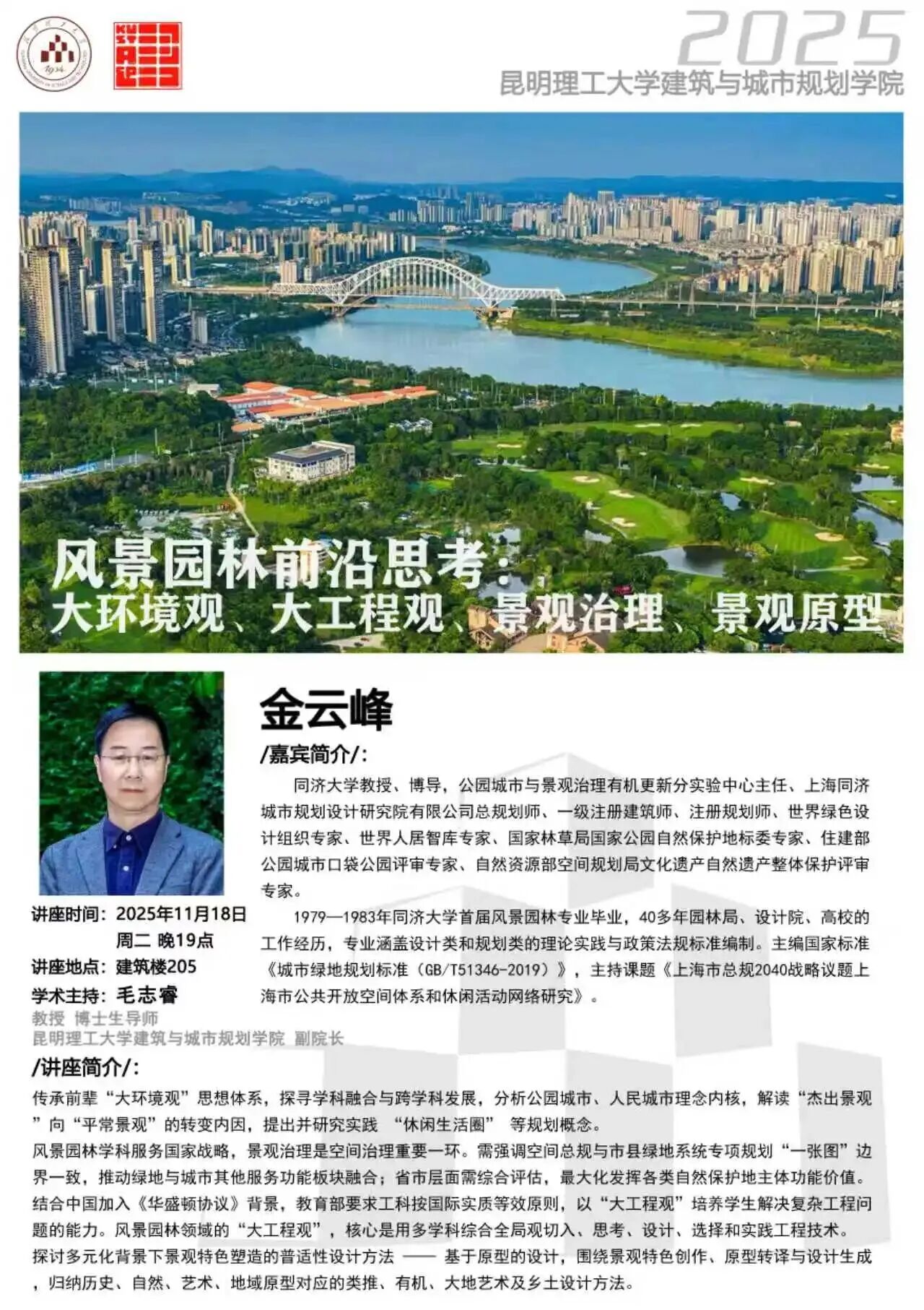 金云峰教授是同济大学教授、博导,公园城市与景观治理有机更新分实验中心主任、上海同济城市规划设计研究院有限公司总规划师、一级注册建筑师、注册规划师、世界绿色设计组织专家、世界人居智库专家、国家林草局国家公园自然保护地标委专家、住建部公园城市口袋公园评审专家、自然资源部空间规划局文化遗产自然遗产整体保护评审专家。