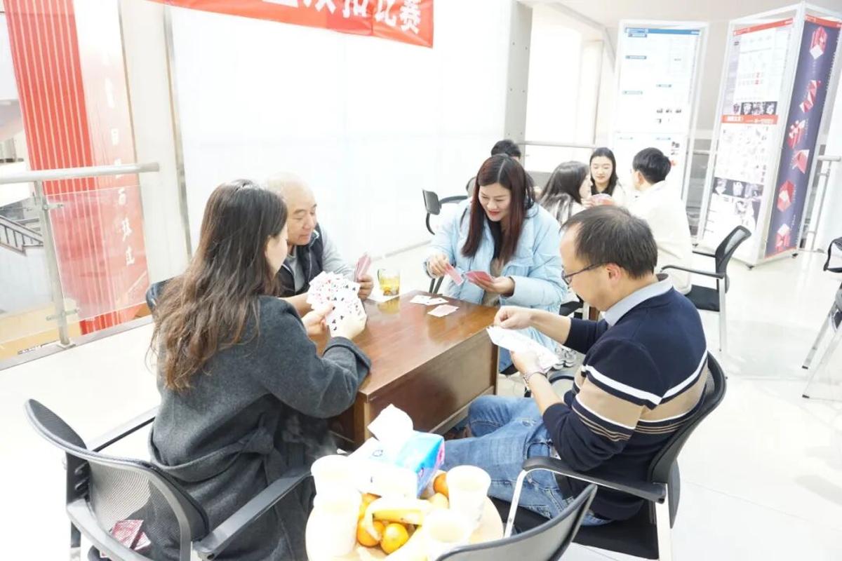 建筑楼二楼的专业展览厅内,16支队伍32名选手聚精会神的进行着扑克比赛。每一张扑克牌都是智慧的火花,每一次对决都是心跳的加速,这不仅考验选手的个人策略运用,更考验的是两人互相配合的团队精神。扑克比赛拉近了师生之间的距离,融洽了师生关系。